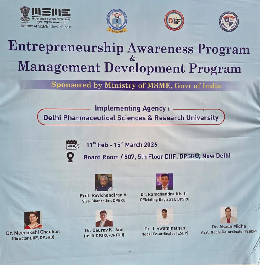 The program was organized under the leadership of Prof. Ravichandiran V., Vice-Chancellor, DPSRU, and guided by Dr. Minakshi K. Chauhan, Director, DIIF. The event was coordinated by Dr. Sheetal Kalra (Program Coordinator), Dr. J. Swaminathan (Nodal Coordinator), and Dr. Akash Midha (Assistant Nodal Coordinator). The initiative reflected DPSRU’s commitment to nurturing innovation and entrepreneurial thinking among healthcare professionals.